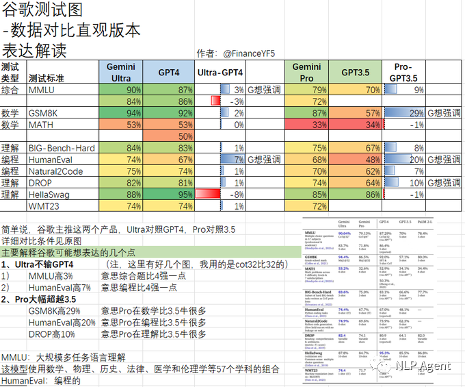 Gemini在文本的数学和编程任务上表现出色,无论是Ultra版本或是Pro版本,都大幅领先于相同level的Openai系列LLM,可以说Gemini和GPT不相上下、平分秋色,是Openai迄今为止最大的竞争者,当然也威胁着Openai背后的微软,最近总是在搞些不痛不痒的动作。