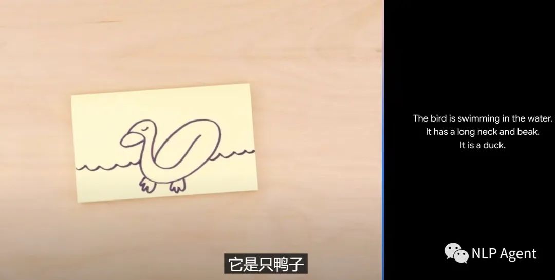 示例:用户在纸上全程手绘出一只鸭子,从线条、轮廓到最后成型的鸭子,Gemini都能实时的和用户进行对话,告诉用户这是曲线、动物轮廓、鸭子,和用户深度的语音交流反馈,不仅语音延迟低到可忽略不计,而且Gemini的声音和语音都像是你的一位老朋友在和你沟通那般亲切,文字语言没有一种冷漠的机械感。
