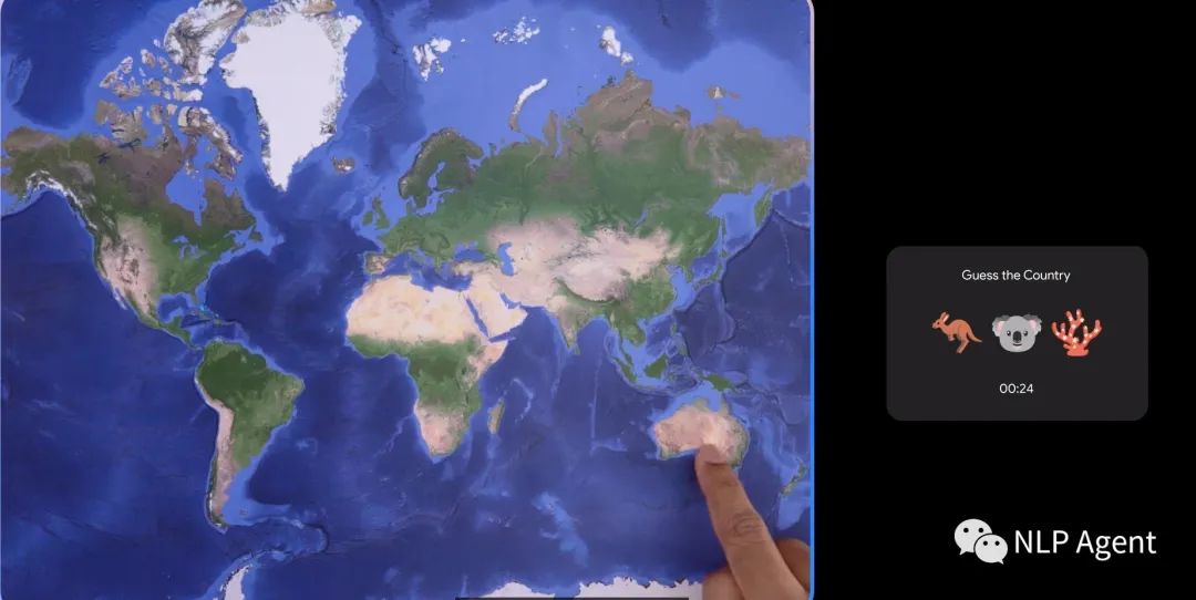 示例:Gemini用语音的方式告诉用户某个国家的特色有袋鼠、考拉等,猜猜是哪一个国家?用户在地图上手指指向澳大利亚,Gemini立刻就回答:”Bingo!“,你答对啦!