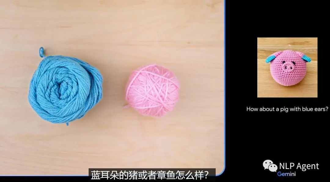 示例:用户提供两个彩色线球,需要Gemini发挥想象,将他们织成一个动物形象的线球,Gemini给出了一个粉色猪头蓝耳朵的线球玩偶,funny。