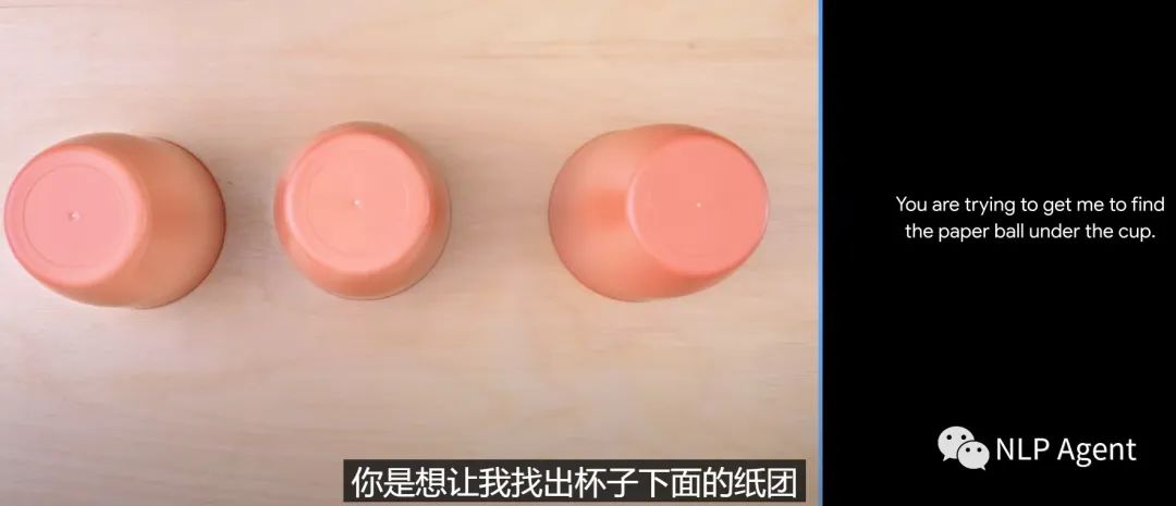 示例:用户将一个纸团放在了某个杯子下,随后快速的移动杯子,试图混淆在三个杯子中,但最后蒙不了Gemini,Gemini同学准确地识别出了盖住纸团的杯子,仿佛在说:就这?