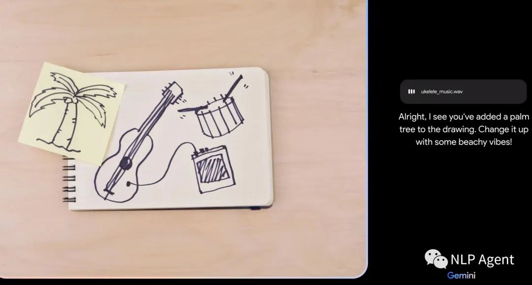 示例:用户在纸上手绘了一个吉他,Gemini立刻生成了一首吉他的曲子音频;然后用户继续手绘了鼓,Gemini也立刻更新了音频,融入了鼓点;最后,纸上出现了一一棵热带植物棕榈树,Gemini也心领神会,立刻将音频更新为热带海滩风格的音乐,而且整个过程交互体验非常棒,perfect!