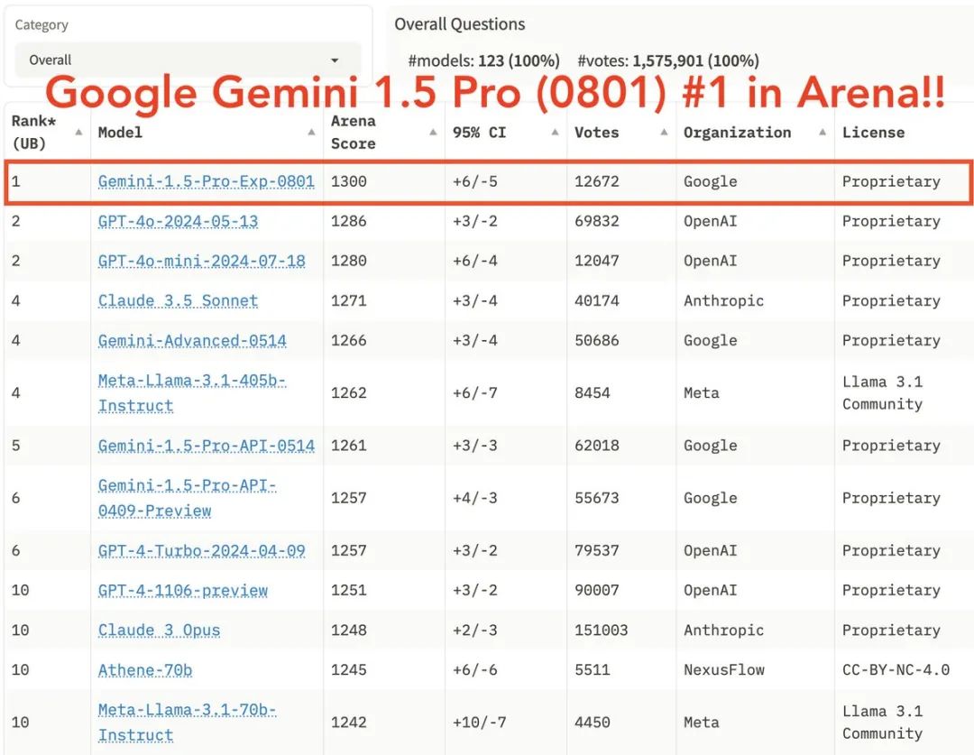 先汇总快速过目Gemini 1.5 Pro(0801)在各个类别的排名: