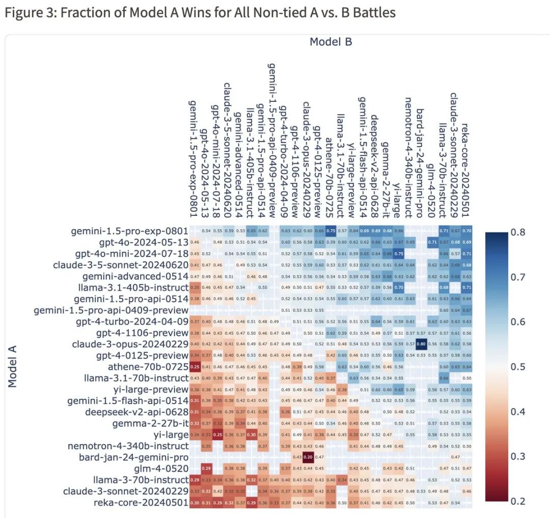 Gemini 1.5 Pro (0801)对阵GPT-4o的胜率是54%,对阵Claude-3.5-Sonnet的胜率更是高达59%。这数据一出来,可以说是相当亮眼了。