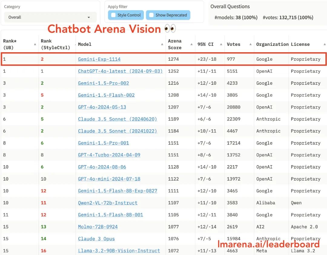 Gemini-Exp-1114 在视觉排行榜上排名第一![]()