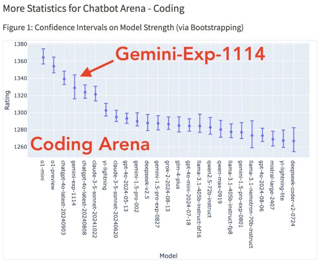 另外Gemini-Exp-1114在Hard Prompts和创意写作类目上也排名第一。但在Codeing类上排名第三,仍落后于ChatGPT-4o和o1。![]()