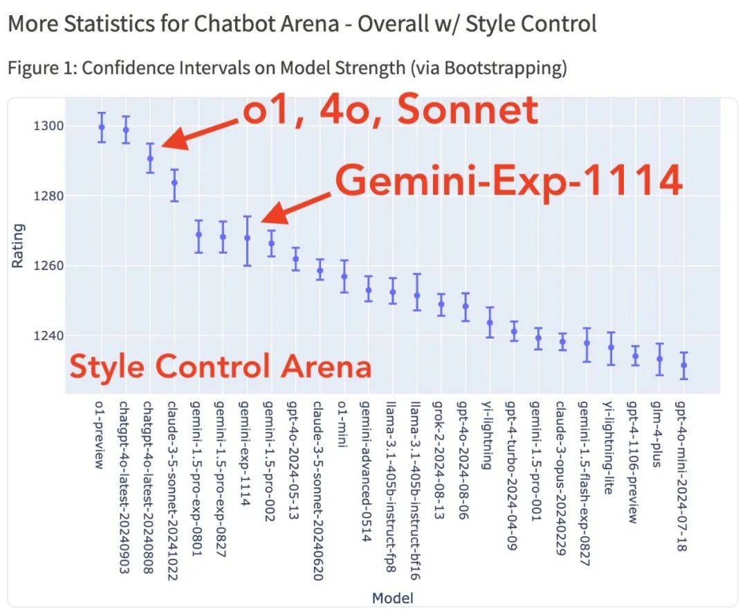 在 Style Control 排行榜中,Gemini-Exp-1114 低于前 3 名型号:o1、4o-latest 和 new Sonnet。![]()