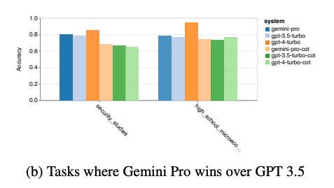 Gemini Pro 确实在两类多项选择题中优于 GPT-3.5 Turbo——安全和高中微观经济学,并且进一步打击了谷歌的雄心壮志,并表示,“对于 Gemini Pro 优于 GPT 3.5 Turbo 的两项任务,收益微乎其微。此外,GPT-4 仍然在所有测试的模型中占据主导地位。
