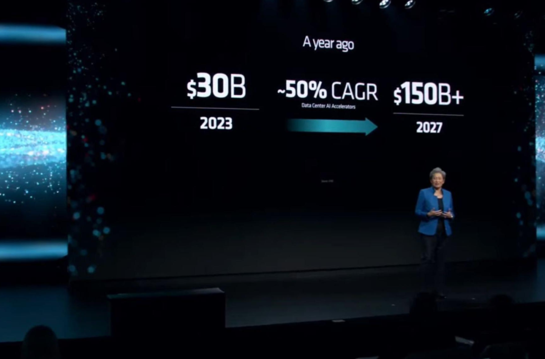 AMD在美国圣何塞的活动上,CEO苏姿丰(Lisa Su)带来了一项备受期待的AI加速芯片:Instinct MI300X。这款AI芯片采用十多个台积电5nm/6nm小芯片组成,拥有1530亿个晶体管,封装CPU+GPU,支持高达192GB的HBM3内存容量。