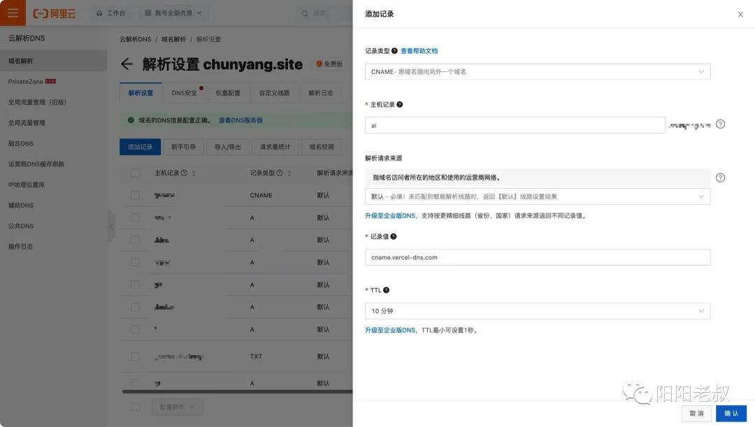 将 CNAME 部署到你的域名服务商中。例如我的是阿里云。