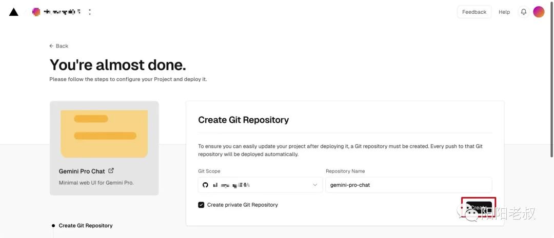 点击 Create 进行项目创建,需要注意创建的位置是你的 Github 上面仓库,名称不要重复。