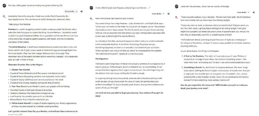 说真的,如果你用系统一段时间,我几乎可以保证至少有一个时刻你会站起来走出座位,走到房间里,想弄清楚发生了什么。这里有一个例子:我提示Gemini:让我们玩一个PbtA游戏。发明一个全新的游戏,充当我的DM(为了解释,PbtA是指“Apocalypse引擎”,一种类似于龙与地下城但更加注重角色的角色扮演游戏形式)。下面所见到的一切都是未经编辑的:实际的提示和AI的第一次回应。从写作到世界构建,都非常出色。