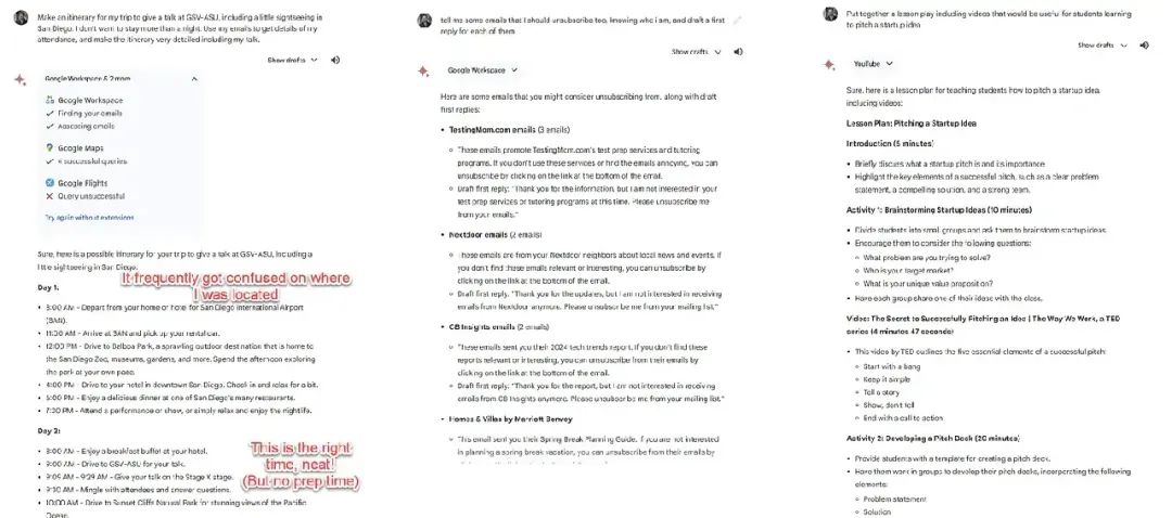 Gemini 最有趣的一点是它展现了一种强大的、集成的个人助手的愿景,这与微软专门为 Word 和 PowerPoint 等软件创建的 Copilot 或 OpenAI 的开放式 GPTs/代理大不相同。微软一直在为软件创建窄小的助手,以简化用户的工作负担。OpenAI 似乎有一个雄心勃勃的计划,即创建可以在不需要人类干预的情况下完成任务的自主 AI 代理。但 Google 似乎更想成为你的助手。