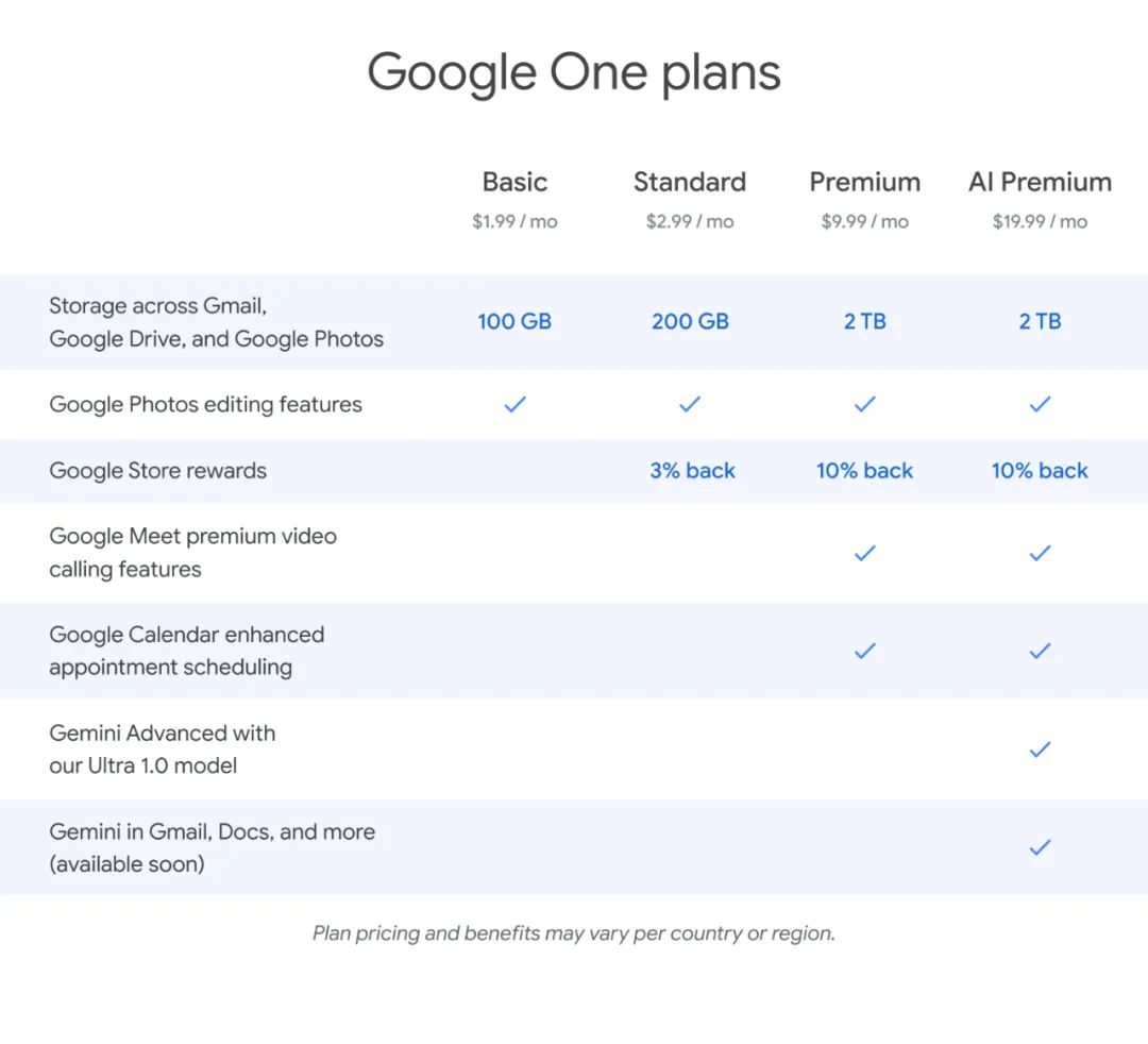 Gemini Advanced 现作为我们全新推出的 Google One AI 高级版套餐的一部分,每月仅需 19.99 美元,最初还将提供两个月免费试用。此套餐将带给你 Google AI 的顶级体验和我们的最新进展,并包含 Google One 高级版计划的所有好处,比如 2TB 的存储空间。另外,AI 高级版的订阅用户不久后还能在 Gmail、Docs、Slides、Sheets 等产品中使用 Gemini(此前称为 Duet AI)。