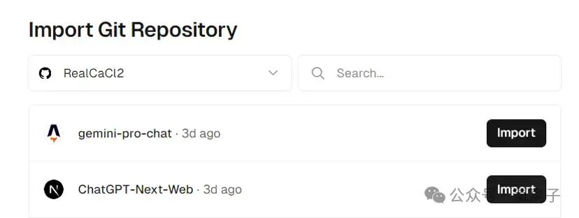 随后我们访问Vercel,使用GitHub直接登录。 点击右上角的 Add New... 下拉选择 Project 在Import Git Repository区域选择刚刚Fork的仓库,点击 Import
