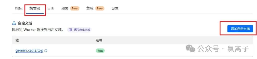 我们在Workers的页面选择 触发器 选项卡,点击 添加自定义域 按钮。(注意:这里添加的域名必须是已经在Cloudflare中绑定的域名)