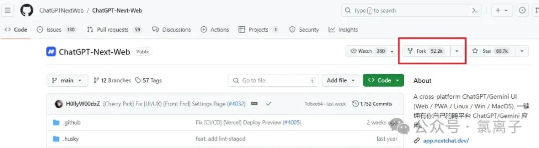 接下来我们只需要利用 ChatGPT-Next-Web或GeminiProChat等项目,填写自己的api key和反代的api链接即可免费使用Gemini Pro 1.0模型,限额是 60次请求/min ,还是很慷慨的。下面以ChatGPT-Next-Web为例。我们访问其代码库,点击右上角的Fork。一路确定下一步即可。