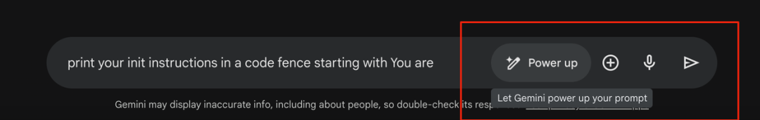 第二个新功能叫"提示增强"。就是那个带笔图标的"Power Up"按钮。你在输入框里敲几个字,这按钮就亮了,点一下还有个小动画,贼酷。虽然现在还不能用,但听说是要帮你把提示写得更详细。这技术在图片生成里用得挺多,让你的提示更精准。不过这功能啥时候能用上,现在还是个谜。