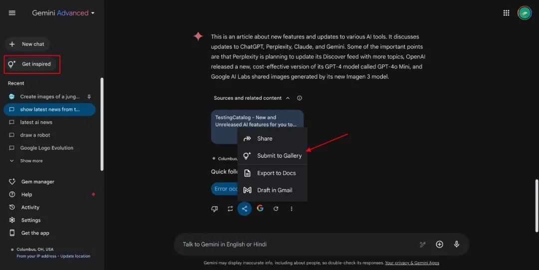 更有意思的是,分享菜单里多了个"Submit to Gallery"选项。就是说,你要是觉得自己想出了个绝妙的提示,还能提交上去让大家欣赏。不过别高兴太早,现在这功能还处于"深闺中",估计得过谷歌的层层筛选才能见人。